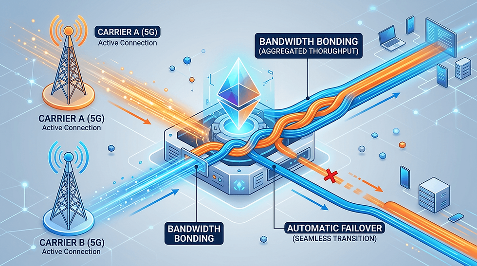 Dual-link aggregation raises the high-availability ceiling. Dual 5G module routers connect two links via different carriers. In Active-Active mode, bandwidth is aggregated while simultaneously providing redundancy. In the event of a failure, no switchover action is required, making the impact on services virtually imperceptible — delivering reliability comparable to dual dedicated lines for critical sites.