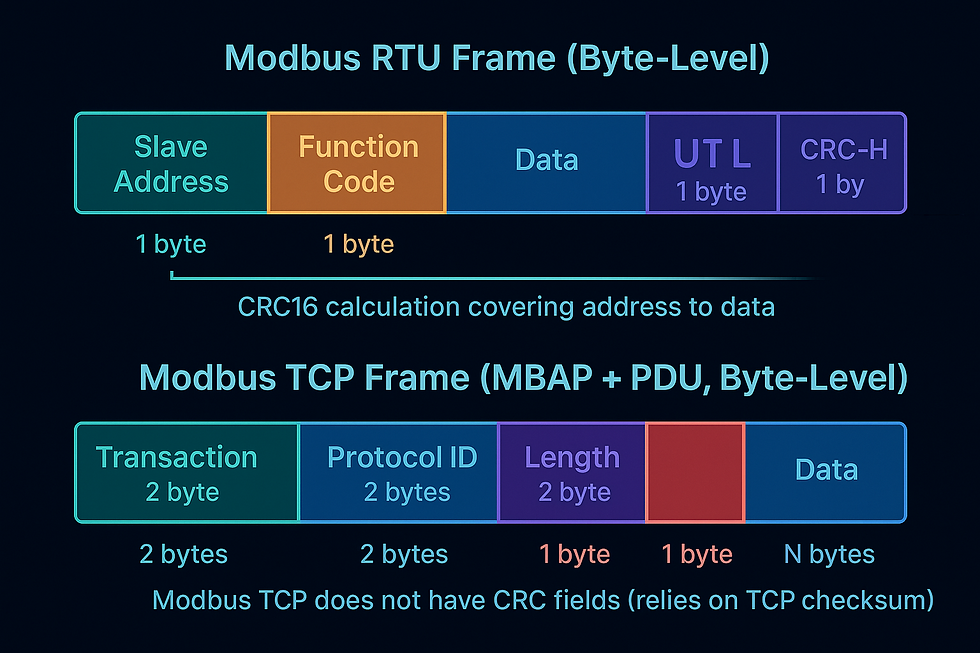 Transportschicht: RTU (CRC-Kapselung) oder TCP (MBAP-Header).