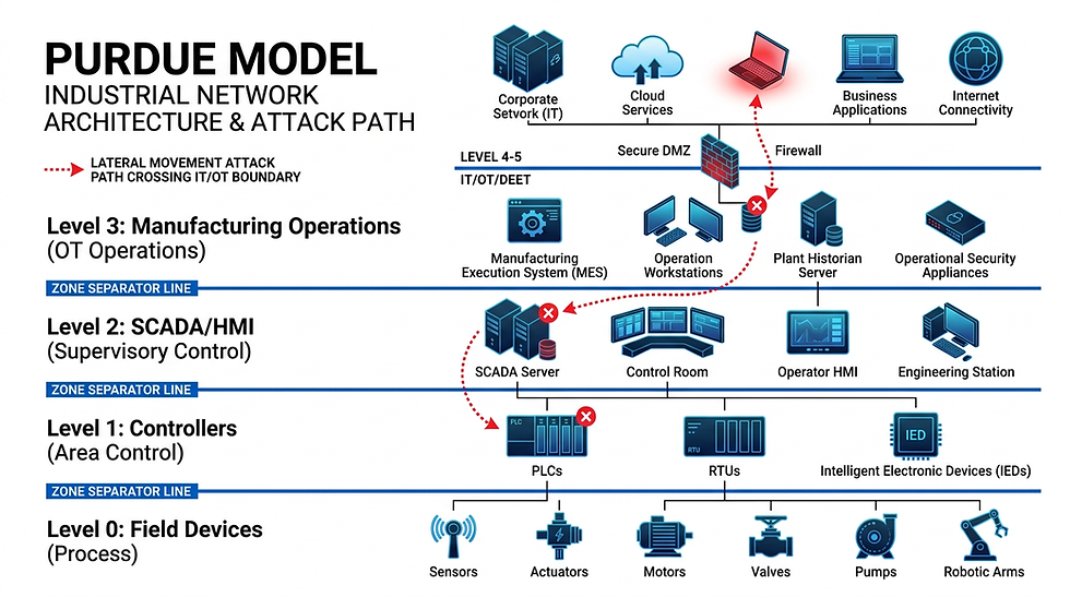 Das Purdue-Modell schreibt eine hierarchische Segmentierung industrieller Netzwerke vor, doch in der Praxis wurde die Netzwerkarchitektur vieler Unternehmen durch Cloud- und Flat-Network-Umstrukturierungen aufgebrochen – Level 0–2 Steuernetze und Level 3–5 Unternehmensnetzwerke kommunizieren direkt miteinander, ohne kritische Sicherheitsgrenzen.